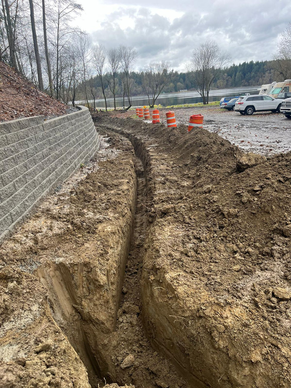 This project showcases various stages of excavation and construction work at different sites. It includes images of workers installing pipes, laying gravel, and working in trenches.